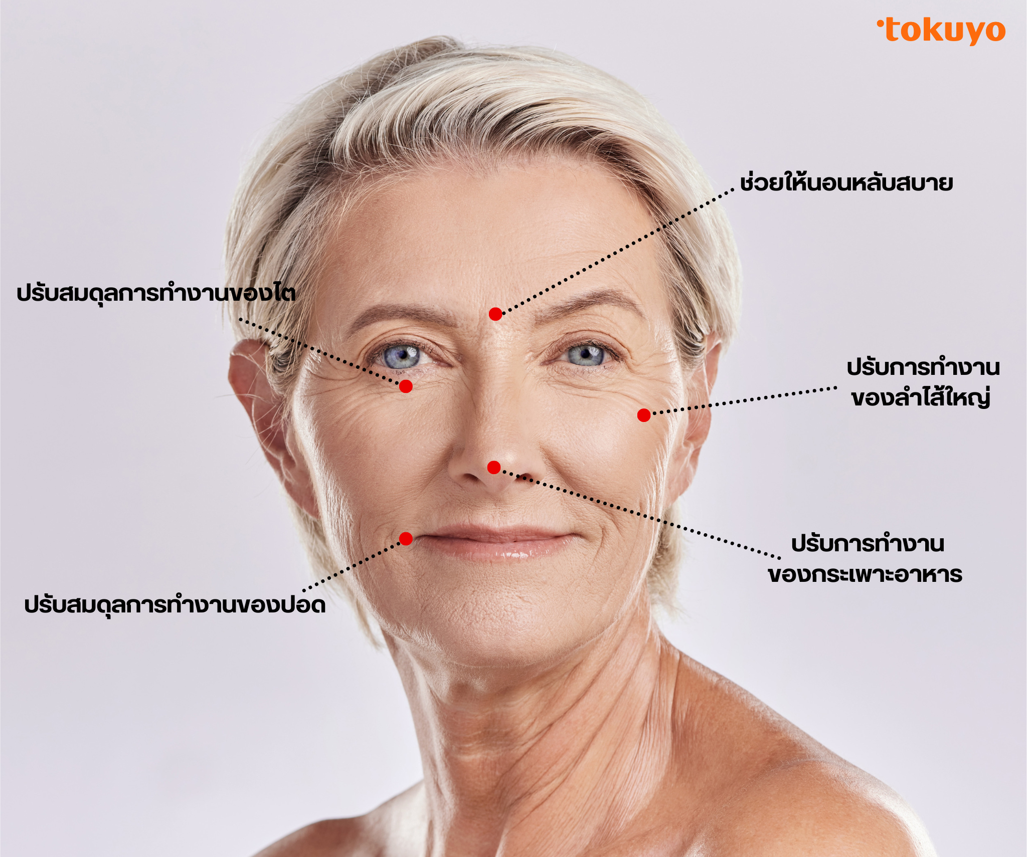 การนวดกดจุดบนใบหน้า มิใช่เพียงให้ผู้ป่วยนอนหลับได้เท่านั้น แต่ยังสามารถช่วยให้ผ่อนคลาย และปรับสมดุลของอวัยวะต่างๆ ในร่ายกาย เนื่องจากบริเวณใบหน้ามีจุดที่เป็นตัวแทนอวัยวะต่างๆ ของร่างกาย เช่น