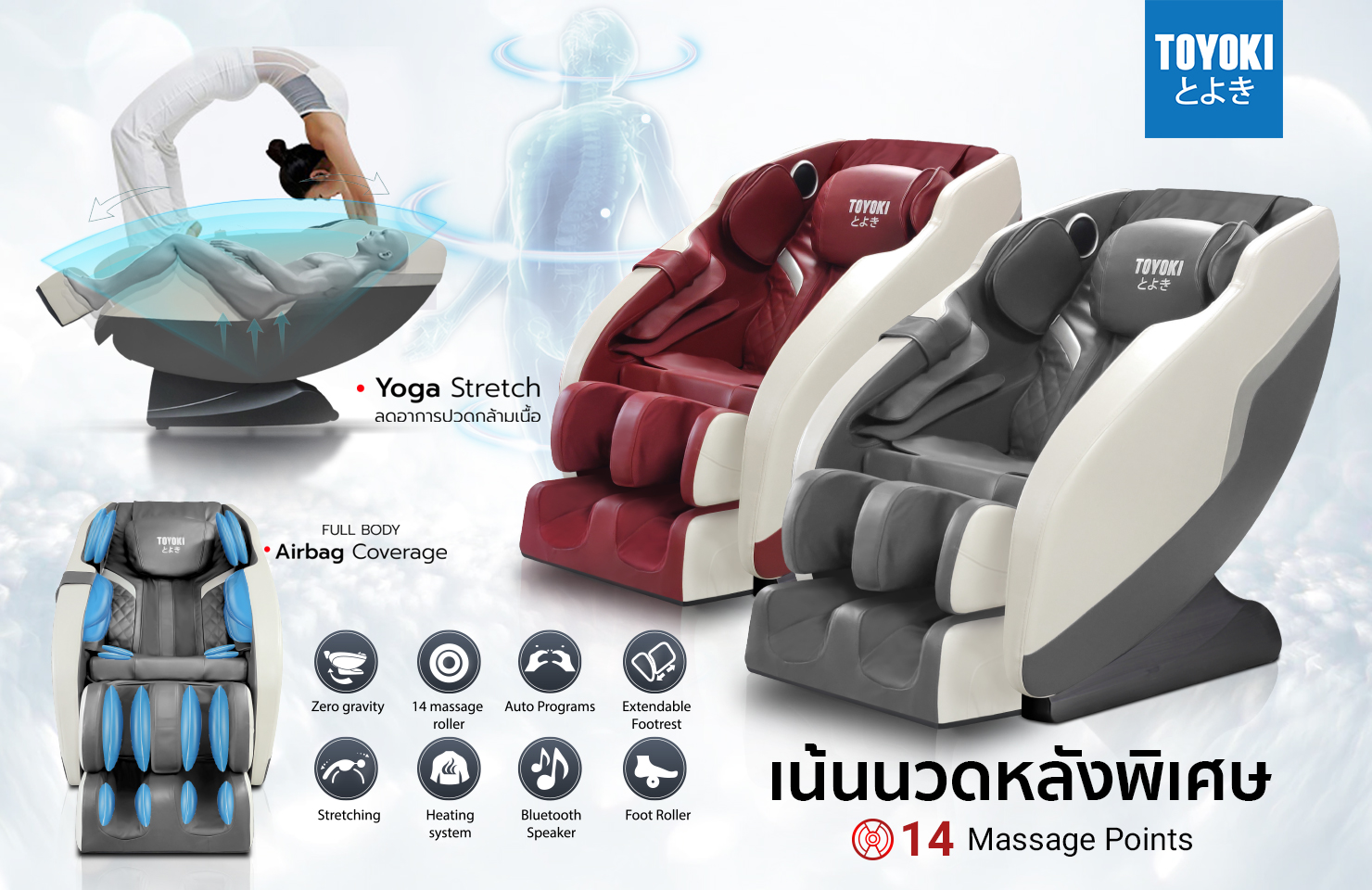 นวดผ่อนคลาย แบบ Full Body ลูกกลิ้งนวด 14 ลูก เน้นนวดทั่วแผ่นหลัง พร้อมถุงลมบีบอัดทั่วร่างกาย