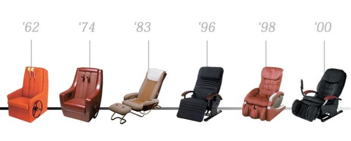 ''เก้าอี้นวดตัวแรกในโลกที่ผลิตขึ้นมีชื่อว่า "Inamasa Bannou Kougeisha" ซึ่งผลิตโดยแบรนด์ที่เรารู้จักในปัจจุบันในชื่อ ''Family Inada'' เมื่อเปิดตัวผลิตภัณฑ์ดังกล่าวได้รับการแนะนำเป็นผลิตภัณฑ์สำหรับใช้ใน บ้านเพื่อช่วยให้ครอบครัวได้ผ่อนคลายหลังจากทำงานหนักมาทั้งวัน ใช้ระบบรอกเพื่อเลื่อนจุดนวดขึ้นลง จึงทำให้เป็นเก้าอี้นวด 1D เนื่องจากจะเลื่อนขึ้นลงเท่านั้น และนี่เป็นจุดเริ่มต้นการเดินทางของเก้าอี้นวดไฟฟ้า...''