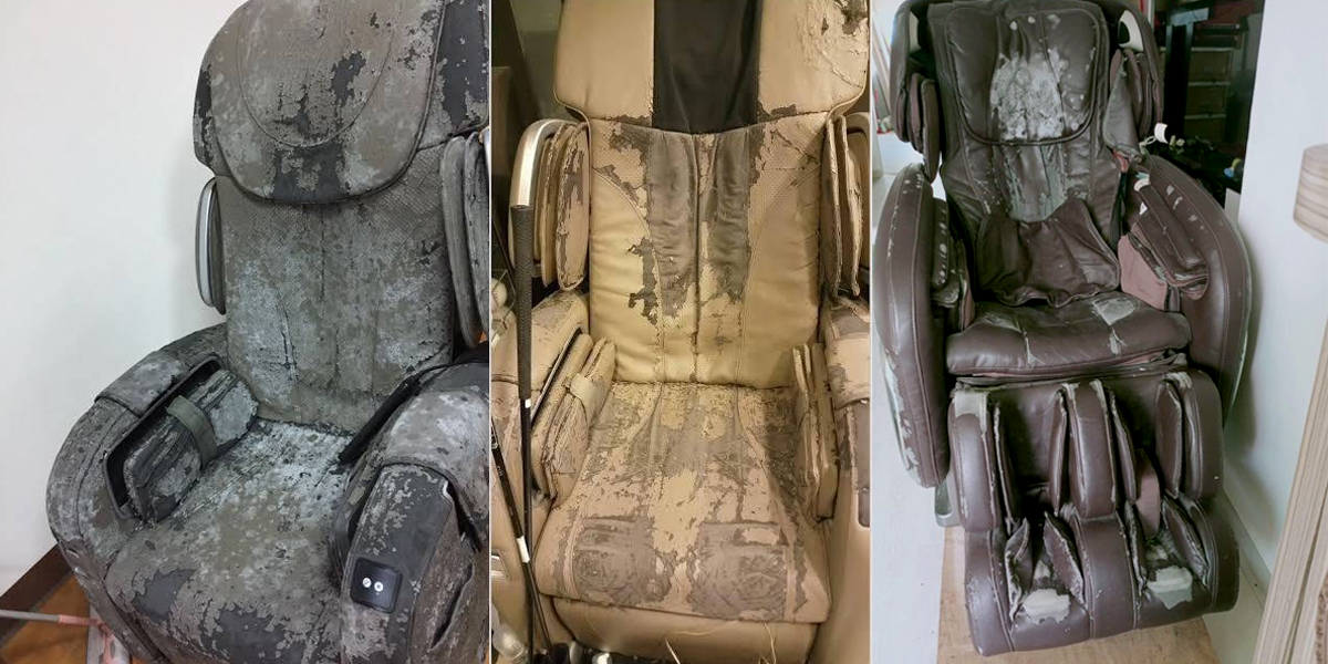 ปัญหาที่ต้องพบเจออย่างหลีกเลี่ยงไม่ได้สำหรับคนที่ซื้อเก้าอี้นวดไฟฟ้า คือ "ปัญหาหนังเสื่อมสภาพ" เช่น หนังลอก หนังกรอบ-แตก ซึ่งจะเริ่มมีปัญหาให้เห็นหลังจากซื้อใช้งานแล้ว 3-6 เดือน โดยเฉพาะเก้าอี้นวดที่มีการใช้งานร่วมกันหลาย ๆ คน (ปัญหาหนังยิ่งจะเสื่อมสภาพไว)