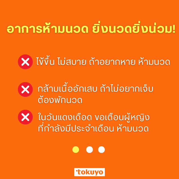 คนป่วยที่มีอุณหภูมิร่างกายมากกว่า 38.5 องศาเซลเซียสขึ้นไป ห้ามนวดเป็นอันขาด เพราะช่วงนั้นร่างกายจะอ่อนแอมาก ๆ หากมีการไปกดจุดหรือกล้ามเนื้อถูกกระทบกระเทือนจะยิ่งทำให้เกิดการอักเสบอย่างรุนแรง
