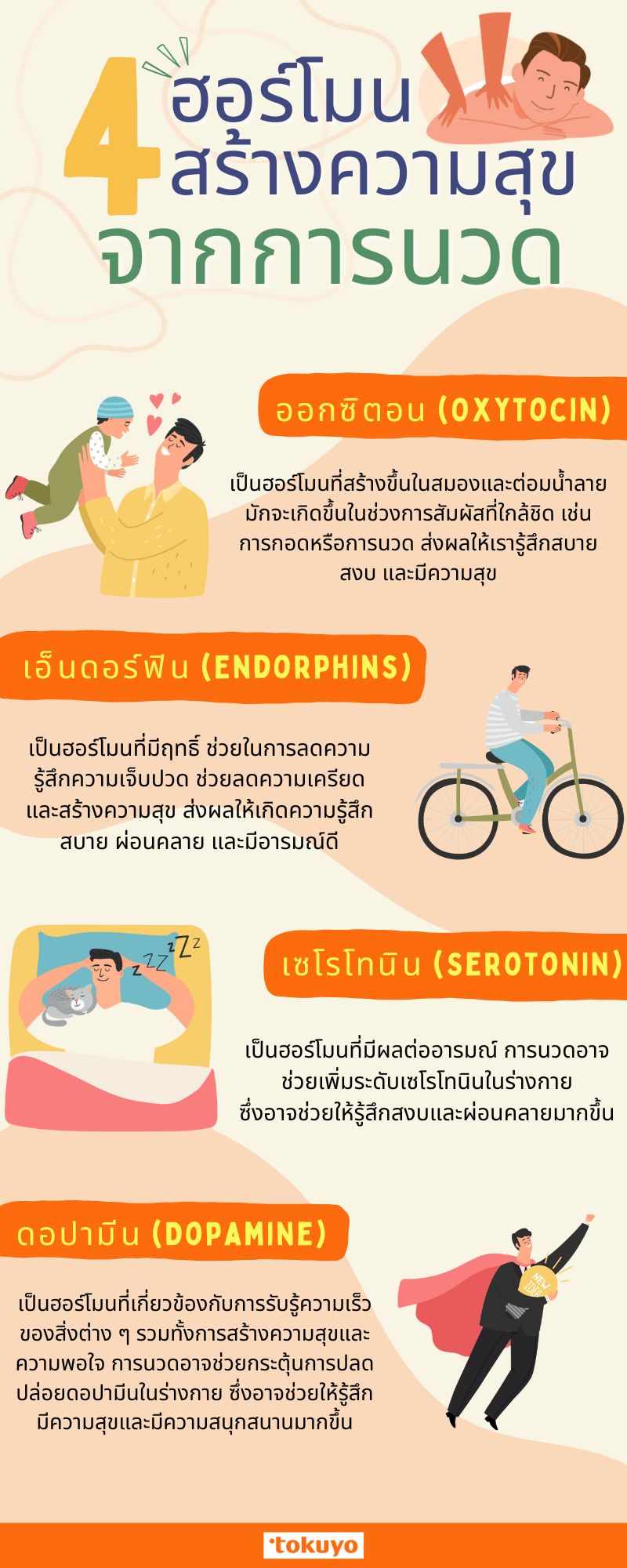 ออกซิตอน (Oxytocin): เป็นฮอร์โมนที่สร้างขึ้นในสมองและต่อมน้ำลาย มักจะเกิดขึ้นในช่วงการสัมผัสที่ใกล้ชิด เช่น การกอดหรือการนวด ส่งผลให้เรารู้สึกสบาย สงบ และมีความสุข